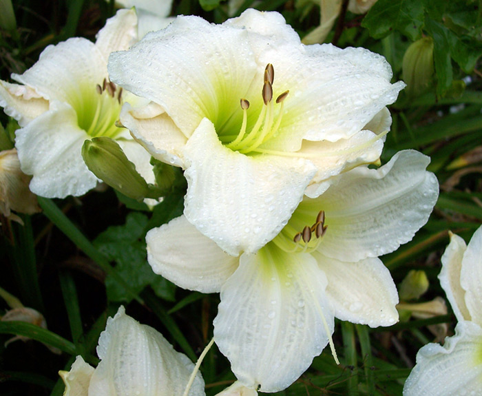 - обильное и продолжительное цветение. Распустившиеся бутоны имеют белоснежные лепестки с немного гофрированным краем и атласным блеском, горлышко при этом нежно-зеленного оттенка. Лилейник Джентл Шеферд прост в уходе, что нисколько не уменьшает красоты этого растения. Взрослый куст имеет обильную листву и множество цветоносов, что создает ароматное цветочное облако.