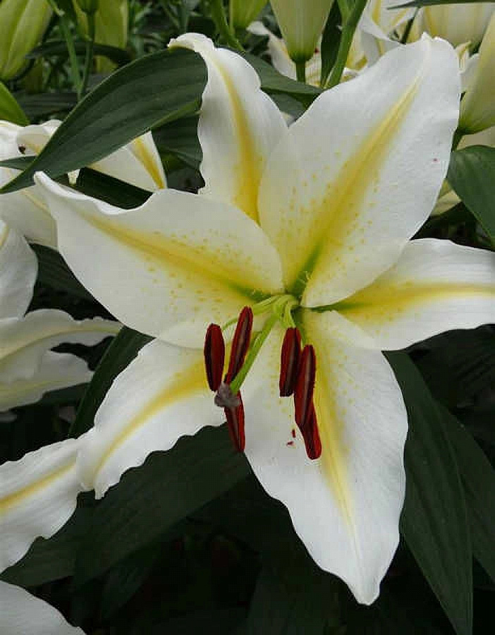 Луковицы лилии восточной Бафферари (Lilium oriental Bafferari) — очень изящный и нарядный сорт, подойдет любителям контрастов и насыщенных оттенков. Он популярен благодаря особенно крупным цветам (до 25 см в диаметре). Лепестки широкие, с ярко-желтым центром и белыми краями — между этими оттенками нет плавного перехода. Пыльники темно-бордовые, создают дополнительный контраст. При грамотном уходе лилии могут расти в открытом грунте до 5 лет без пересадки. Взрослое растение достигает 110–120 см, отличается мощным стеблем и высокой устойчивостью к перепадам температур и вредителям. Если на зиму срезать стебли и накрыть луковицы, за них можно не переживать даже при заморозках до –35 градусов.