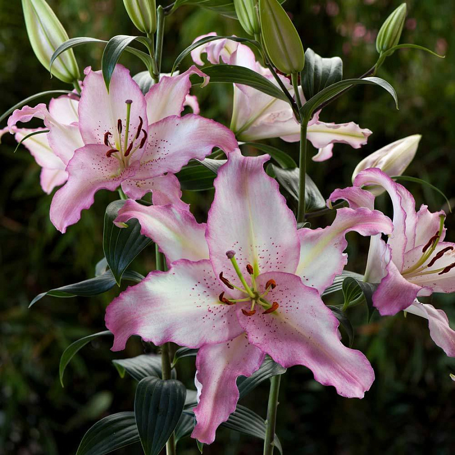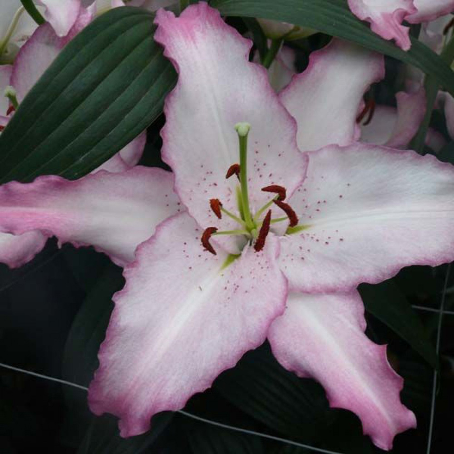 Саженцы и рассада восточной Лилии Бразилия (Lilium oriental hybrids Brasilia) из разряда восточных теплолюбивых и солнцезависимых гибридов, на прочных метровых стеблях которых расположены цветки с диаметром в 20 см. Несмотря на внушительные объемные размеры соцветий с нежно-лилейным окрасом, тонкими малиновыми краями и веснушчатой серединкой, упругие стебли не требуют даже подвязки. Прежде чем приступить к посадке, обработайте луковицы легким раствором марганцовки. Находясь рядом с таким очаровательным цветком, вы останетесь без ума от его привлекательно-насыщенного запаха, который доставляет истинное наслаждение.